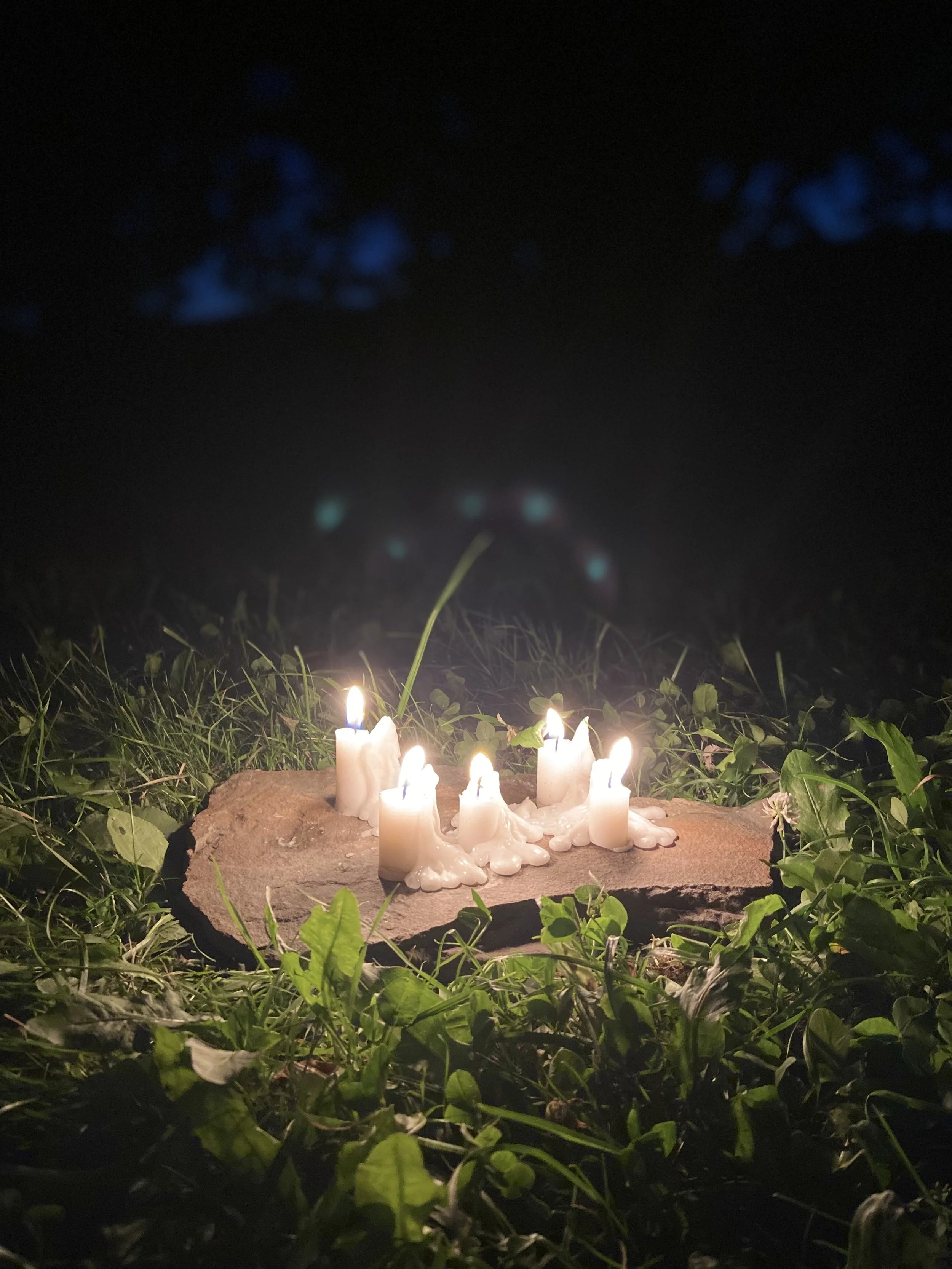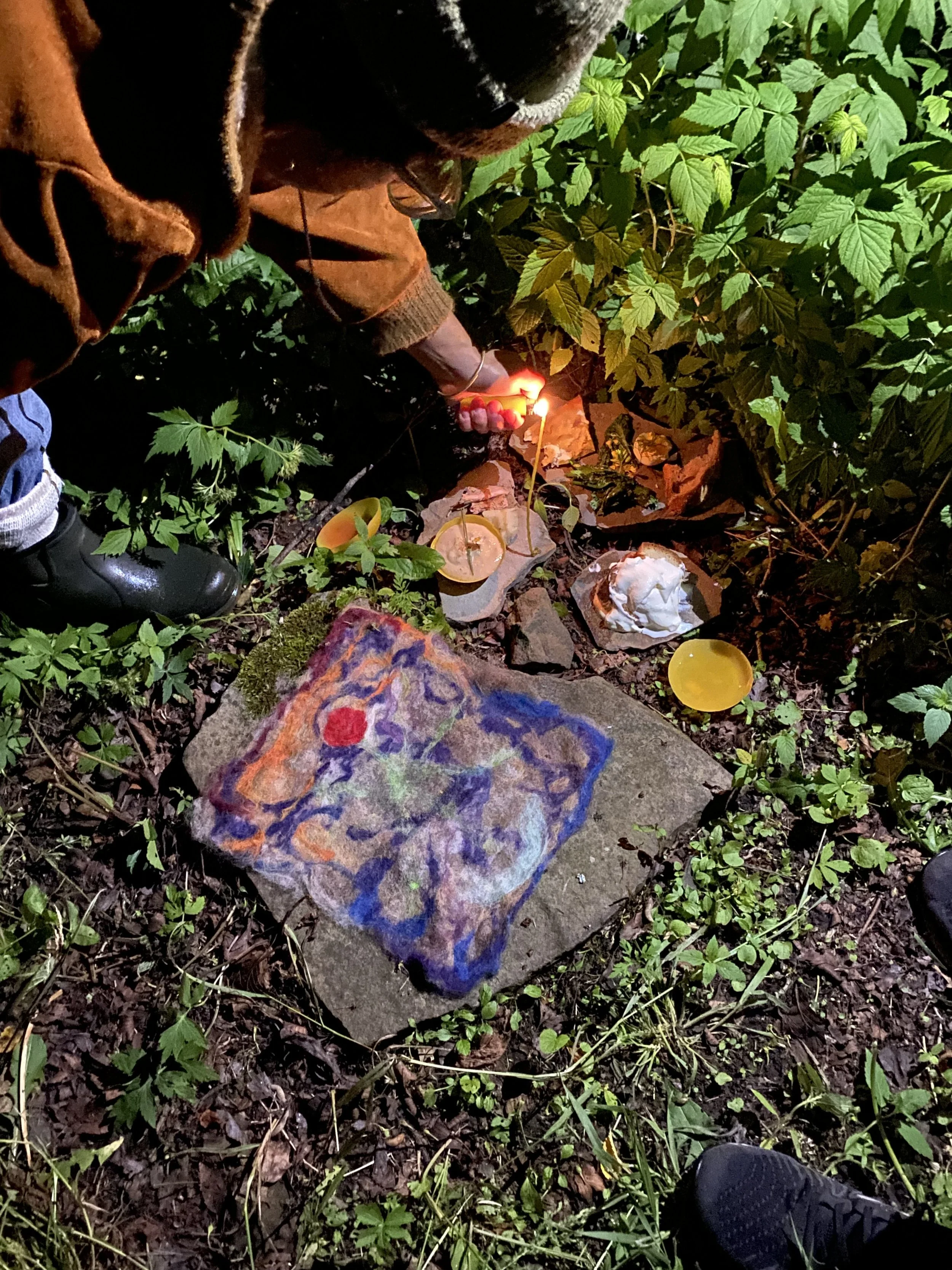 The day after the Solstice Feast, I prepared a few small plates of food from the meal we ate together, to make an offering to the land and the beings present. I walked into trees and placed the offering and poured libations of water and drink. I lit a candle. I sang to the plants, the sky, the land, the waters, the animals, the insects, the web of all beings. I made an offering with smoke, over myself, in the directions, into the sky, into the land, the smoke carrying my thanks, my recognition that yes, we are together in this creation, in this place, at this time.